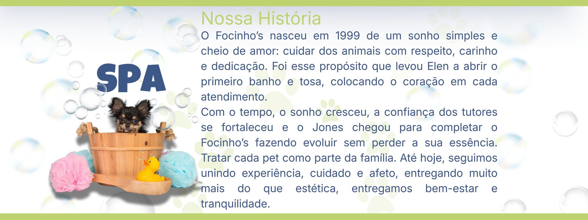 Há 26 anos, o Focinho's Estética Animal transforma o banho do seu pet em uma experiência leve, acolhedora e cheia de carinho, respeitando cada detalhe do bem-estar de quem faz parte da sua família.